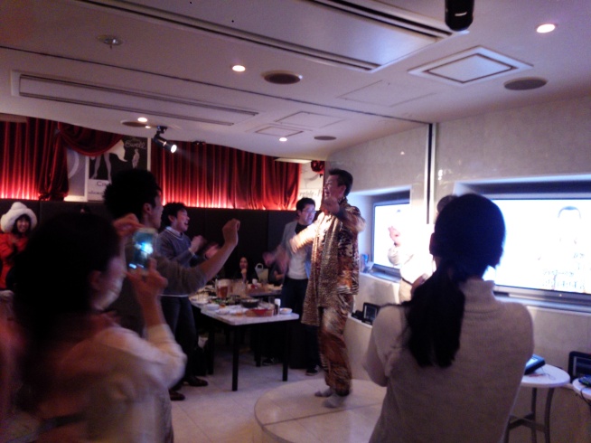 社長は当時流行のピコ太郎の衣装をプレゼントされ舞台へ。